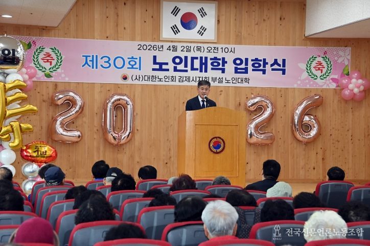 전국신문언론노동조합 강찬희 기자 | 김제시는 대한노인회 김제시지회가 2일 지회 2층 강당에서 노인대학생 및 관계자 등 약 220명이 참석한 가운데 '2026학년도 제30회 노인대학 입학식'을 개최했다고 밝혔다.