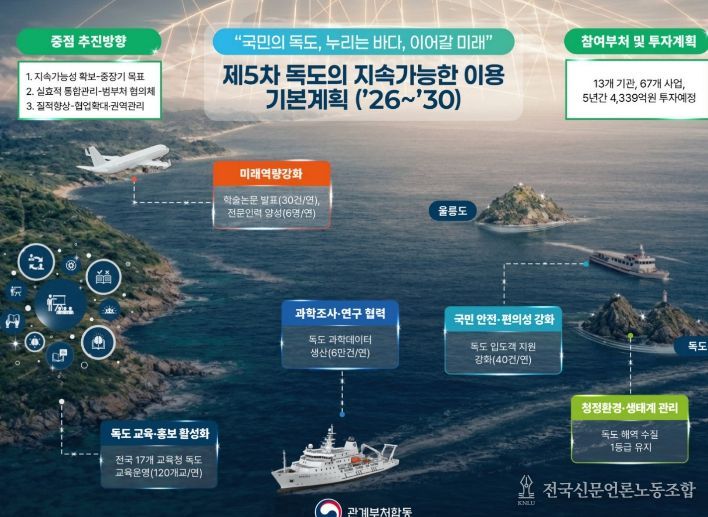 전국신문언론노동조합 강찬희 기자 | 경상북도는 정부가 발표한 ‘제5차 독도의 지속가능한 이용을 위한 기본계획’과 2026년 시행계획에 발맞춰 독도의 실질적 관리주체로서 현장중심의 정책을 본격 추진한다.