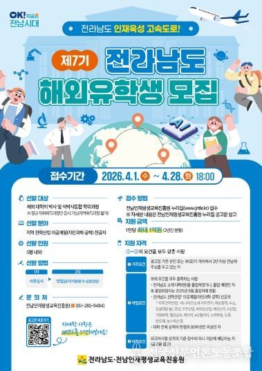전국신문언론노동조합 강찬희 기자 | 전라남도와 전남인재평생교육진흥원은 글로벌 핵심 인재 육성을 위해 세계 명문대 유학 기회를 제공하는 ‘제7기 전라남도 해외유학생’을 오는 28일까지 모집한다고 밝혔다.