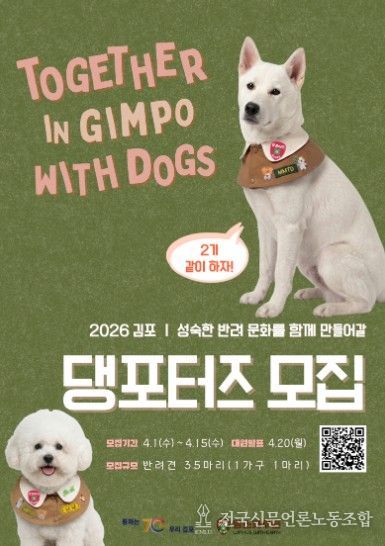 전국신문언론노동조합 김성길 기자 | 김포시는 올바르고 책임 있는 반려문화 확산을 이끌 ‘김포 댕포터즈’를 모집한다고 밝혔다.