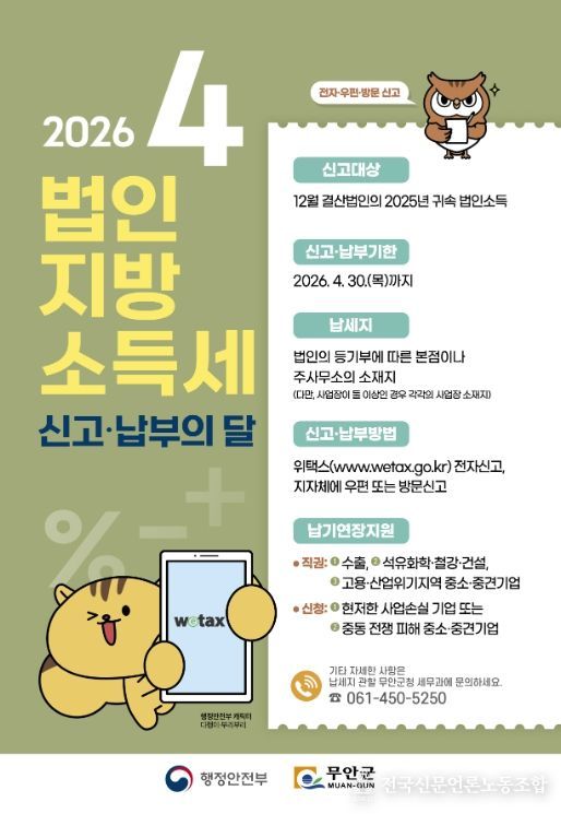 전국신문언론노동조합 강찬희 기자 | 전남 무안군은 법인 소득에 대해 지방자치단체에 납부하는 법인지방소득세 신고·납부 기간을 맞아 오는 4월 30일까지 집중신고기간을 운영한다고 밝혔다.