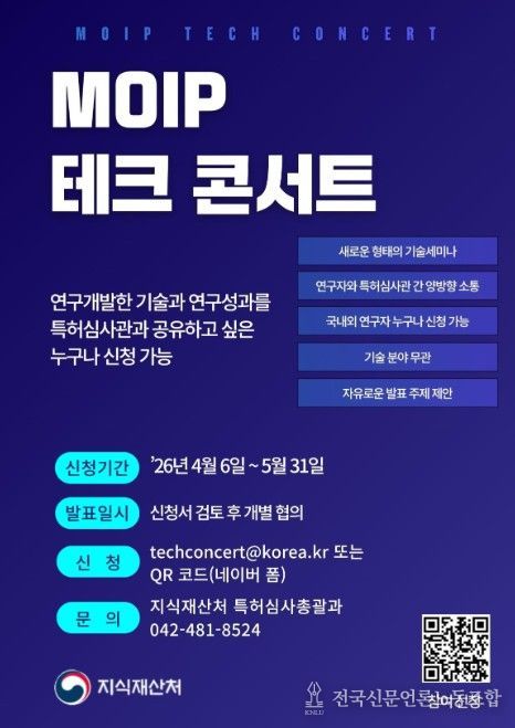 전국신문언론노동조합 강찬희 기자 | 지식재산처는 4월 6일~5월 31일까지 기업 및 연구소가 개발하거나 연구한 최신 기술을 특허심사관과 공유하고, 연구자와 특허심사관과의 직접적인 소통을 강화하기 위한 ‘지식재산처(MOIP) 기술 공연(MOIP Tech Concert)'에 참여할 우수 연구자를 모집한다고 밝혔다.