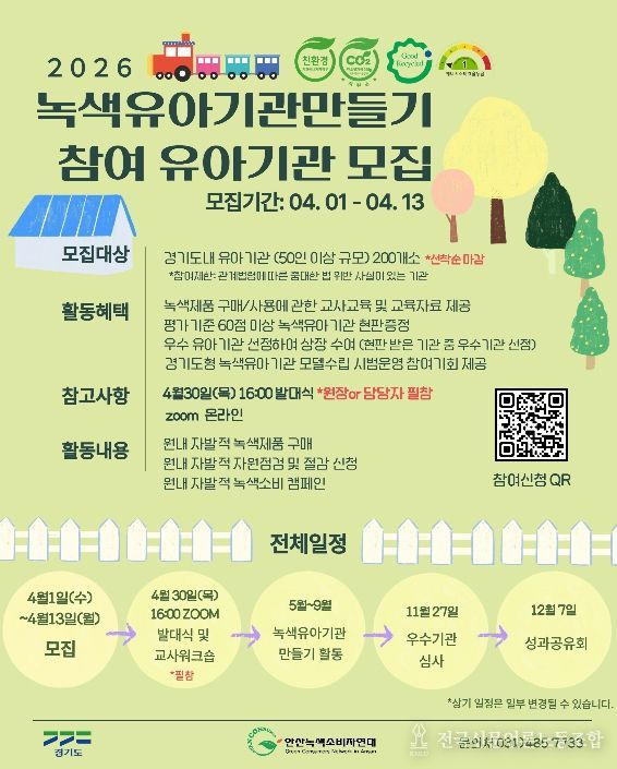 전국신문언론노동조합 김성길 기자 | 경기도가 아이들이 생활 속에서 올바른 녹색 소비 습관을 가질 수 있도록 돕는 ‘2026년 녹색유아기관만들기’ 참여 기관 200곳을 4월 13일까지 모집한다.