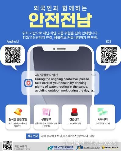 한편, ‘다국어 안전전남 앱’은 스마트폰 앱스토어에서 무료로 내려받을 수 있다.