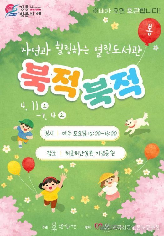 전국신문언론노동조합 강찬희 기자 | 강릉시립도서관은 다가오는 따뜻한 봄을 맞아 오는 11일부터 7월 4일까지 허균허난설헌 기념공원에서 ‘자연과 힐링하는 열린도서관 북적북적’ 봄 시즌을 운영한다고 밝혔다.