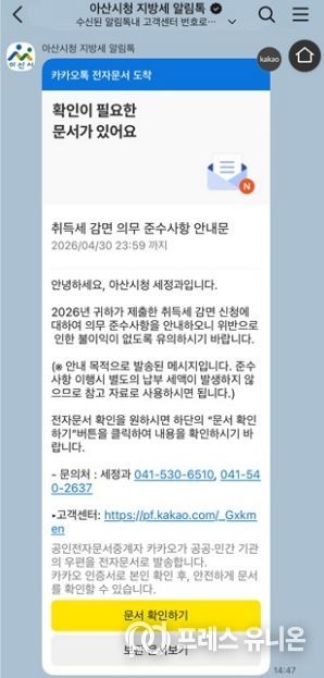 프레스유니온 강찬희 기자 | 아산시는 취득세 감면 혜택을 받은 납세자가 준수사항 미숙지로 인해 가산세를 부담하는 사례를 방지하고자 ‘취득세 감면 의무 준수사항 카카오톡 알림톡 서비스’를 운영하고 있다.