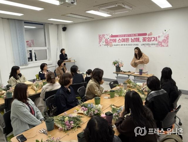 프레스유니온 강찬희 기자 | 남해군종합사회복지관은 군민을 대상으로 자기돌봄 역량강화를 위해 지난 4월 7일부터 4월 31일까지 매주 화, 목요일에 총 8회기에 걸쳐 ‘집 안에 스며든 남해, 꽃향기’ 프로그램을 운영한다고 밝혔다.