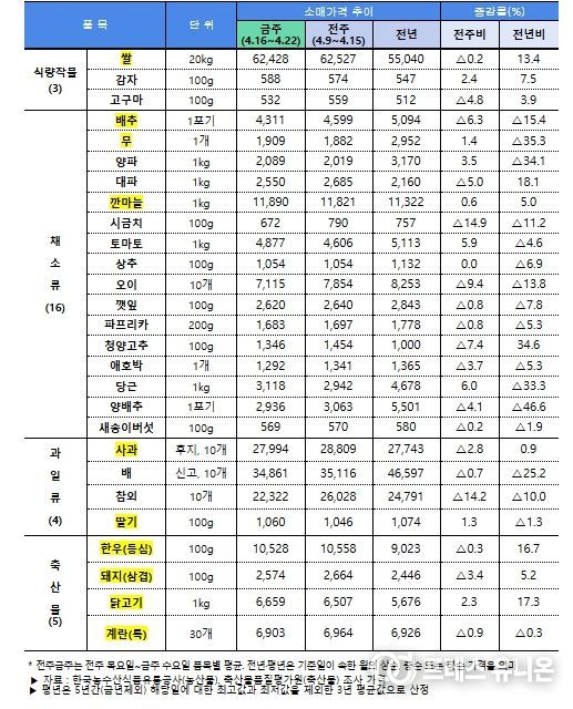 프레스유니온 강찬희 기자 | 농림축산식품부는 4월 5주 수급동향 점검 결과, 지난주와 특별한 변동 없이 농산물 가격은 전반적으로 전년 대비 낮은 수준을 유지하고 있는 것으로 나타났다고 밝혔다.