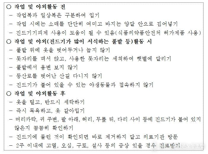 김명길 감염병연구부장은 “주말농장, 등산, 제초작업, 골프 등 야외 활동 시에는 기피제를 사용하고 긴 소매·긴 바지·장갑 등으로 피부 노출을 최소화해야 한다”며 예방 수칙을 강조했다.