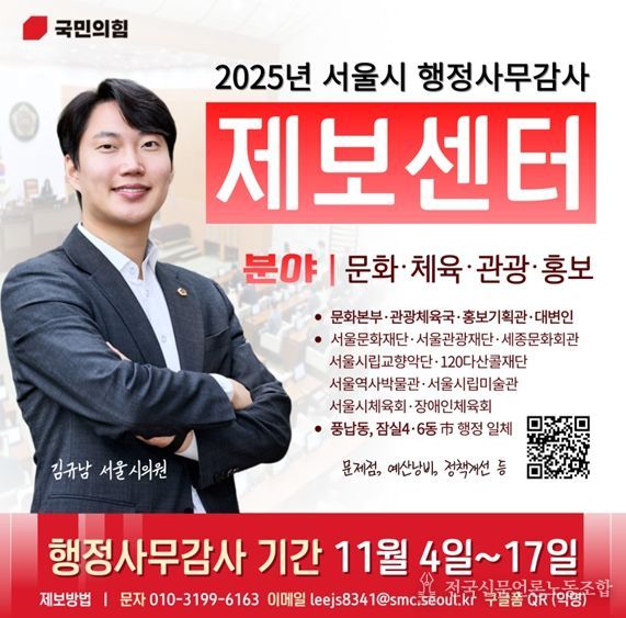 전국신문언론노동조합 강찬희 기자 | 김규남 서울시의원(송파1·국민의힘)은 오는 11월 4일부터 17일까지 열리는 2025년도 서울시 행정사무감사를 앞두고 시민 참여를 위한 제보센터를 운영한다고 30일 밝혔다.