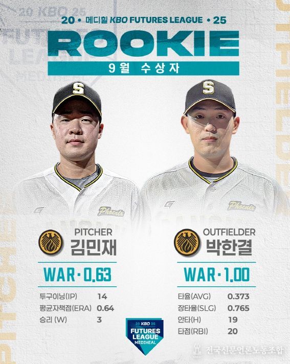 전국신문언론노동조합 강찬희 기자 | 2025 메디힐 KBO 퓨처스리그의 9월 퓨처스 루키상 수상자로 투수 부문에는 상무 김민재가 WAR 0.63, 타자 부문에는 상무 박한결이 WAR 1.00을 기록하며 각각 선정됐다.