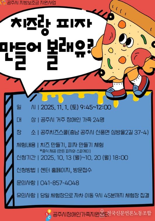 이번 프로그램은 오는 11월 1일 공주시 신풍면에 위치한 공주치즈스쿨에서 진행되며, 참여 가족들은 치즈와 피자를 직접 만들고 함께 나누어 먹으며 특별한 시간을 보낼 예정이다.