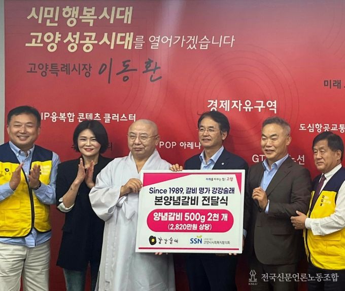 전국신문언론노동조합 강찬희 기자 | ㈜전한의 외식브랜드 강강술래(대표 노상환)가 10월 10일, 고양특례시에 본양념갈비 500g 2,000개(2,820만 원 상당)를 기탁했다. 이번 전달식은 고양특례시청 열린시장실에서 진행됐으며, 이동환 고양특례시장, 김민숙 고양특례시의원(고양, 관산, 원신), 노상환 강강술래 대표, 김응화 고양시사회복지협의회 회장이 함께 자리했다.