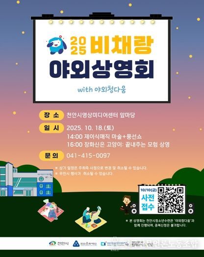 전국신문언론노동조합 강찬희 기자 | 천안문화재단은 오는 18일 천안시영상미디어센터에서 ‘2025 비채랑 야외상영회’를 운영한다고 13일 밝혔다.