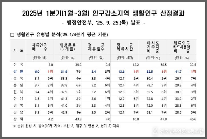 전국신문언론노동조합 강찬희 기자 | 강원특별자치도는 행정안전부가 9월 25일 발표한 ‘2025년 1분기 인구감소지역 생활인구 산정 결과’에서 체류인구 총 2,826,012명으로 전국 최고 수준을 기록했다고 밝혔다.