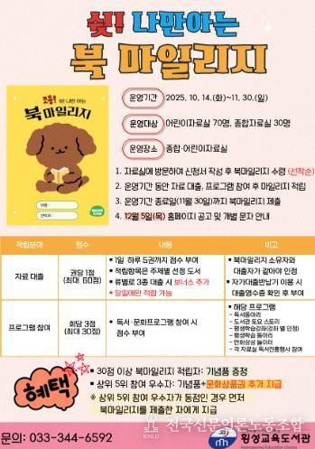 전국신문언론노동조합 강찬희 기자 | 횡성교육도서관은 10월 14일부터 11월 30일까지 지역주민의 독서 활동을 장려하고 도서관 이용을 활성화를 위해 ‘쉿, 나만 아는 북 마일리지’ 프로그램을 운영한다고 밝혔다.