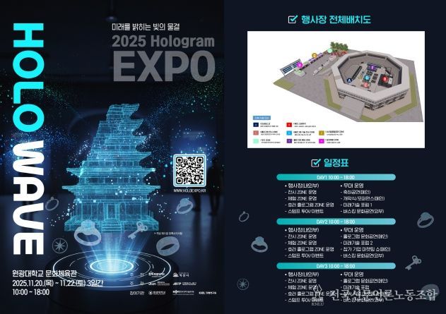 전국신문언론노동조합 김성길 기자 | (재)전북특별자치도 콘텐츠융합진흥원(원장 김성규)은 ‘2025 홀로그램 엑스포 HOLO WAVE’가 오는 11월 20일부터 22일까지 3일간, 오전 10시부터 오후 6시까지 익산 원광대학교 문화체육관에서 개최된다고 밝혔다.