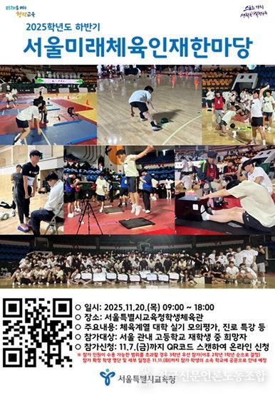 전국신문언론노동조합 강찬희 기자 | 서울특별시교육청은 체육계열 대학 진학을 희망하는 학생들을 지원하기 위해 수능 직후부터 '2025년 서울특별시교육청 체육계열 대학 정시 진학 설명회'(11월 18일, 서울고)와 '2025학년도 하반기 서울미래체육인재한마당'(11월 20일, 서울특별시교육청학생체육관)을 연이어 개최하며 체육계열 진학지도 집중 지원 프로그램을 운영한다.