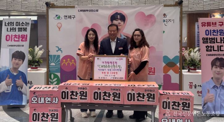 전국신문언론노동조합 조창제 기자 | 연제구는 11월 17일 가수 이찬원 팬클럽(CWBB부산찬스방)으로부터 지역 내 어려운 이웃을 돕기 위한 성금 600만 원을 전달받았다.