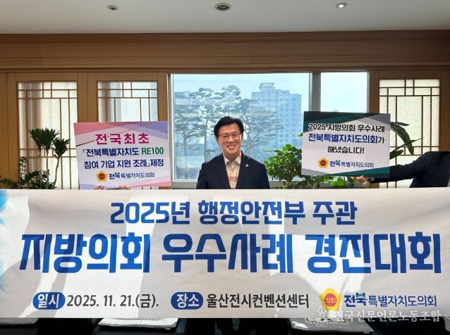 전국신문언론노동조합 김성길 기자 | 전북특별자치도의회가 지난 21일 울산전시컨벤션센터에서 열린 행정안전부 주관 ‘2025년 지방의회 우수사례 경진대회’에서 본선에 진출해 수상하는 영예를 안았다.