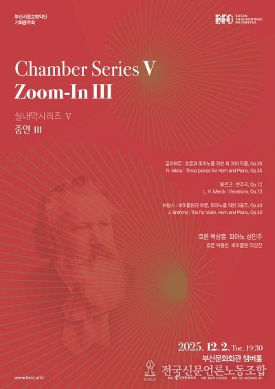 전국신문언론노동조합 조창제 기자 | 부산시립교향악단(수석객원지휘자 홍석원)의 실내악 시리즈 '줌인'의 세 번째 무대가 오는 12월 2일 부산문화회관 챔버홀 무대에 오른다.