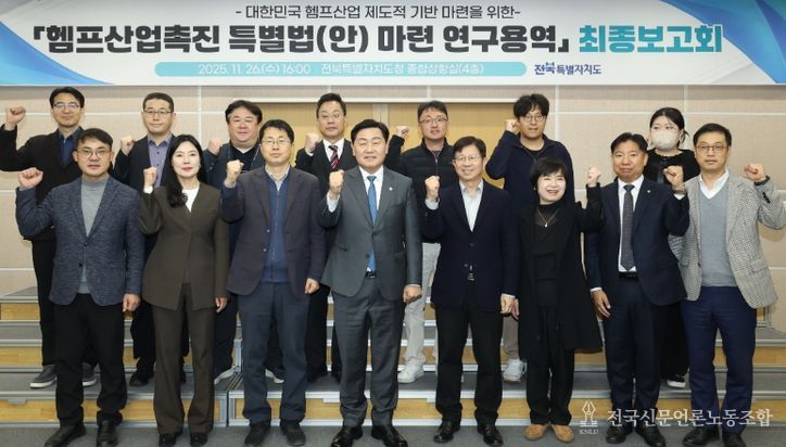도는 26일 도청 종합상황실에서 '헴프산업촉진 특별법안 보완 및 조문별 조서작성 연구용역' 최종보고회를 개최했다. 이날 보고회에는 도와 새만금개발청, 헴프 관련 기업, 외부 전문가, 용역 수행기관 등 30여 명이 참석해 특별법 제정의 필요성과 추진 전략을 논의했다.