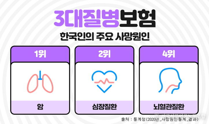전국신문언론노동조합 강찬희 기자 | 한국인의 주요 사망원인중에 암, 뇌혈관질환, 심혈관질환은 흔히 3대질병이라 일컬어지며 살아가면서 가장 먼저 대비해야 하는 중대질병으로 항상 강조되고 있다. 이들 질병에 미리 대비하기 위해 가입하는 것이 진단비보험인데, 이러한 3대질병진단비를 중점으로 보장하는 보장성보험이 3대진단비보험 이다. 3대질병진단비보험은 각각의 질병에 주목해서 보장하기도 하지만, 나에게 맞는 추가 특약을 잘 골라서 가입한다면 종합건강보험으로도 충분히 활용도가 높다.