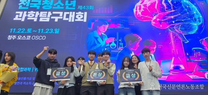 전국신문언론노동조합 김성길 기자 | 충청북도교육청 직속기관 자연과학교육원은 지난 11월 22일과 23일 양 일간, 청주 오스코(OSCO)에서 개최된 2025년 제43회 청소년과학탐구대회에서 충북 대표로 출전한 6개 팀이 금상 2개, 은상 3개, 동상 1개를 획득하며 전원 입상하는 쾌거를 이뤘다고 밝혔다.