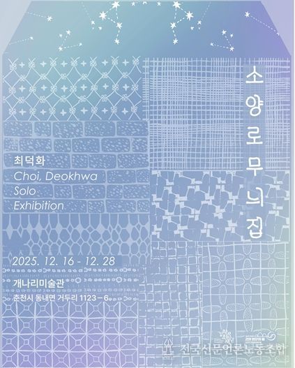 전국신문언론노동조합 강찬희 기자 | 강원문화재단(대표이사 신현상)은 '2025 강원다운작품개발지원' 2년차 지원사업에 선정된 최덕화 작가의 개인전 '소양로 무늬집'이 오는 16일부터 28일까지 춘천 개나리미술관에서 개최된다고 밝혔다.