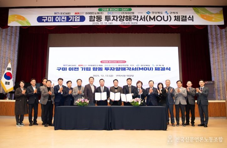 전국신문언론노동조합 강찬희 기자 | 경상북도와 구미시는 12일 구미시청 대강당에서 양금희 경상북도 경제부지사, 김장호 구미시장, 박교상 구미시의회 의장, 그리고 투자기업 대표들이 참석한 가운데 미래첨단소재㈜, ㈜디씨티, ㈜두이산업과 합동 투자양해각서(MOU)를 체결했다.