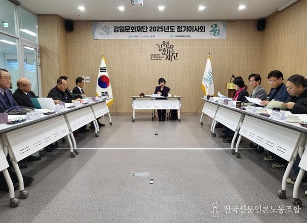 전국신문언론노동조합 강찬희 기자 | 강원문화재단은 올해 재단 운영의 성과를 되짚어 보고, 2026년도 사업계획 및 취업규칙 정비를 위한 제규정 개정안 등을 논의하는 2025년도 정기이사회를 17일 재단 회의실에서 개최했다.