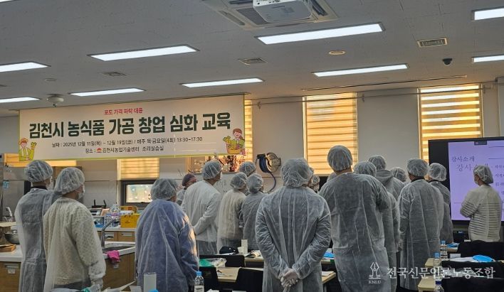 전국신문언론노동조합 강찬희 기자 | 김천시는 12월 19일 오후, 김천시농업기술센터 농촌생활교육관 조리실습실에서 ‘2025년 김천시 농식품 가공 창업 심화 교육’ 수료식을 성황리에 개최했다.