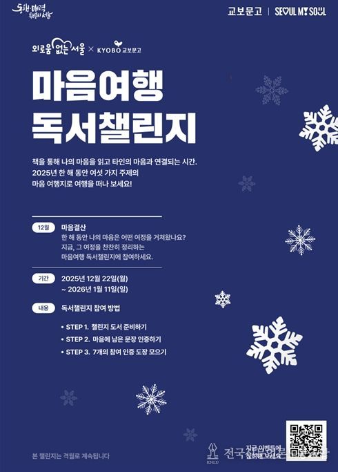 전국신문언론노동조합 강찬희 기자 | 서울시가 ‘외로움 없는 서울’을 만들기 위한 노력의 일환으로 교보문고와 함께 여섯 번째 ‘마음여행 독서챌린지’를 진행한다. 이번 챌린지는 ‘마음결산’을 주제로, 올해 나의 마음을 움직인 책과 그 속에서 기억에 남는 문장을 선택해 ‘2025 마음결산 리포트’를 완성하며 한 해의 여정을 마무리한다.