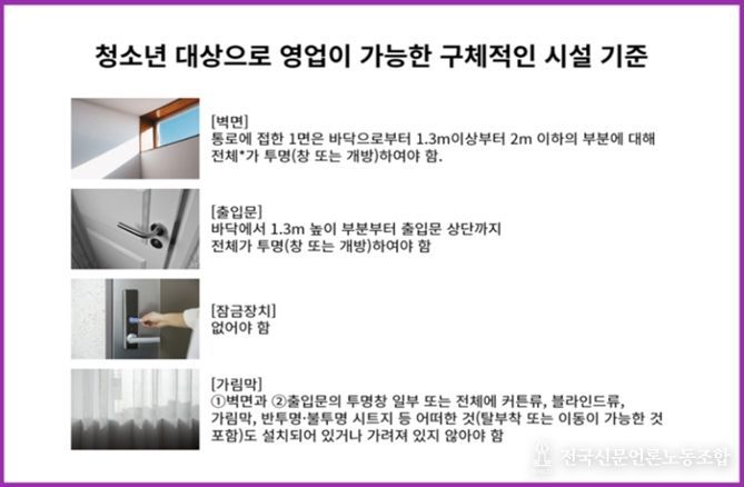 이처럼 청소년유해업소를 밀실 형태로 운영하면서 청소년 출입·고용금지 표시를 하지 않고 영업할 경우에는'청소년보호법'제29조에 따라 2년 이하의 징역 또는 2천만 원 이하의 벌금 처벌을 받게 된다.
