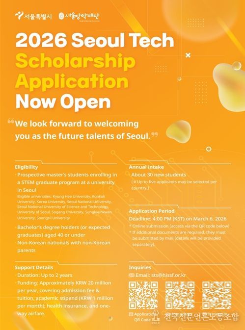 전국신문언론노동조합 강찬희 기자 | 서울장학재단이 기존 개발도상국 중심이던 지원 자격을 국적 제한 없이 전면 개방하고, '2026년 서울테크스칼러십(Seoul Tech Scholarship)' 장학생 30명을 선발한다. 서울의 미래 산업을 이끌 글로벌 이공계 우수 인재를 서울로 적극 유치하기 위한 전략이다.