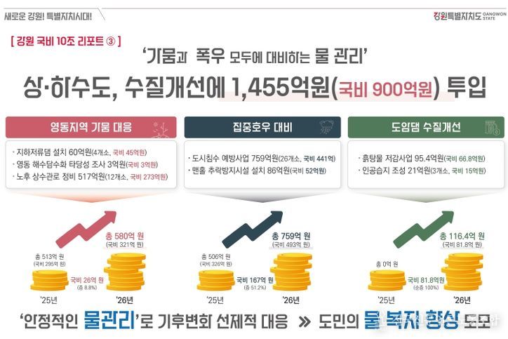 전국신문언론노동조합 강찬희 기자 | 강원특별자치도는 내년도에 1,455억 원을 투입하여 가뭄 및 집중호우 등 물로 인한 기후변화와 자연재해로부터 안전한 강원자치도를 만들어 나갈 계획을 밝혔다.