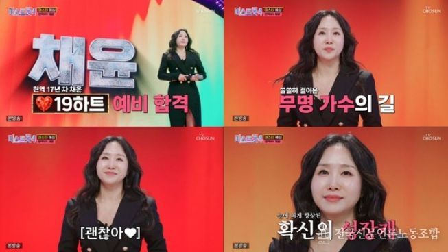 이날 방송에서 채윤은 이은하 원곡의 ‘겨울 장미’를 열창했다. 특유의 짙은 음색과 세월이 묻어나는 감정 표현으로 마스터 심사위원들은 물론, 시청자들의 마음까지 울리며 깊은 여운을 남겼다. 그 결과 채윤은 총 19하트를 받으며 예비 합격자가 됐다.