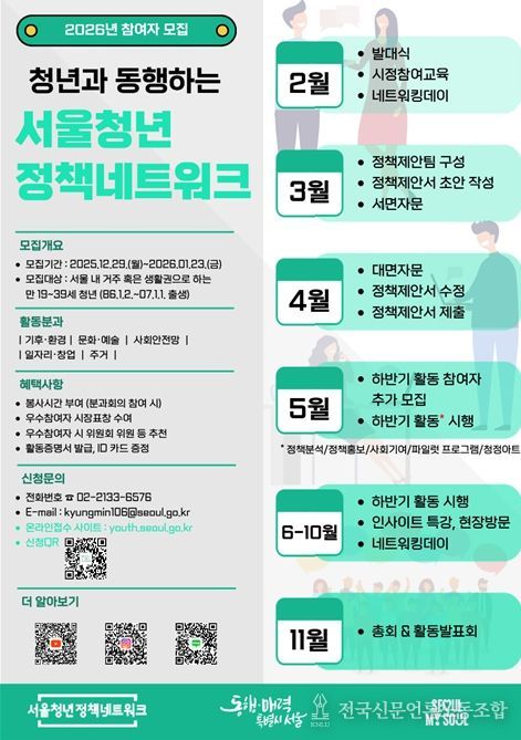 전국신문언론노동조합 강찬희 기자 | 서울시는 청년이 서울시정에 참여해 정책을 제안하는 서울청년정책네트워크 신규 위원 350명을 모집한다. 신청기간은 2025년 12월 29일부터 2026년 1월 23일까지이고, 청년몽땅정보통에서 접수를 받는다.