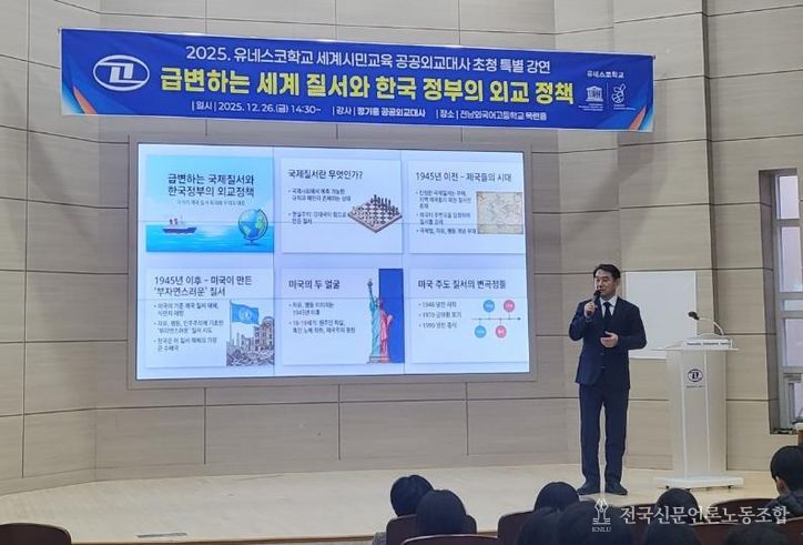 전국신문언론노동조합 김성길 기자 | 전남교육 꿈실현재단은 26일 전남외국어고등학교에서 정기홍 외교부 공공외교대사를 초청, ‘급변하는 국제질서와 한국 정부의 외교정책’을 주제로 특별 강연을 열었다.