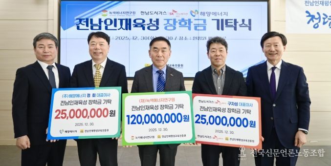 전국신문언론노동조합 김성길 기자 | 전라남도는 30일 인재육성 장학금으로 (재)녹색에너지연구원이 1억 2천만 원, 전남도시가스(주)가 2천500만원, ㈜해양에너지가 2천500만 원을 전남인재평생교육진흥원에 기탁했다고 밝혔다.