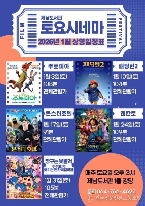 전국신문언론노동조합 김성길 기자 | 제주도교육청 제남도서관은 내년 1월 3일부터 12월 26일까지 매주 토요일 오후 3시 도서관 강당(지하)에서 영화 상영 프로그램 ‘토요시네마’를 운영한다.