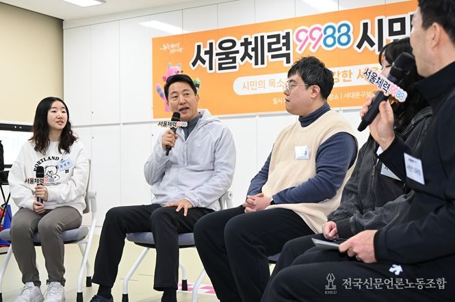 전국신문언론노동조합 강찬희 기자 | 서울시가 체력인증센터를 찾은 시민들의 생생한 체험 경험을 공유하고 앞으로의 개선 방안을 모색하기 위해 1월 5일 ‘서울체력9988 시민 간담회’를 개최했다. 이날 현장을 찾은 오세훈 서울시장은 새해를 맞아 시민 누구나 일상 속에서 참여할 수 있는 ‘건강 5대장 챌린지’를 깜짝 발표하며 눈길을 끌었다.