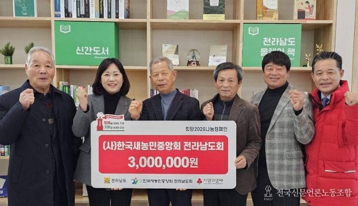 전국신문언론노동조합 김성길 기자 | 전라남도는 7일 (사)한국새농민중앙회 전남도회가 연말연시 이웃사랑 실천을 위한 ‘희망2026 나눔캠페인’에 성금 300만 원을 전달했다고 밝혔다.