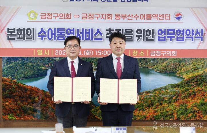 전국신문언론노동조합 이의용 기자 | 금정구의회는 2026년 1월 6일, 금정구의회 의장실에서 동부산수어통역센터(센터장 여복기)와 '본회의 수어통역 서비스 제공을 위한 업무협약'을 체결했다.