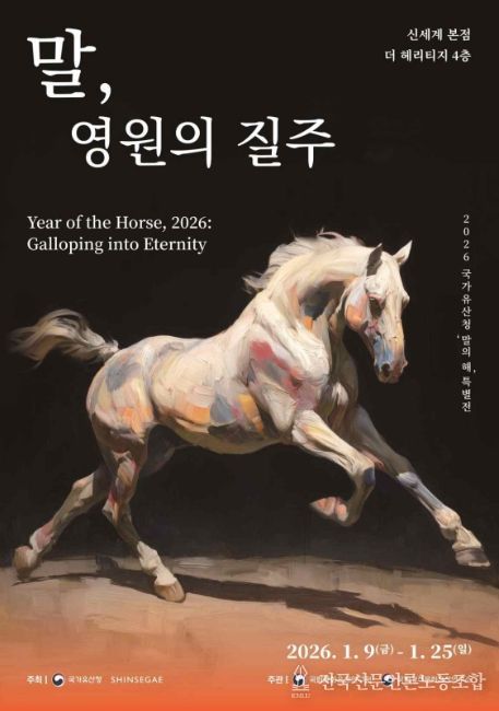 전국신문언론노동조합 강찬희 기자 | 국가유산청은 ㈜신세계와 함께 1월 9일부터 1월 25일까지 신세계백화점 본점 더 헤리티지(서울 중구)에서 말의 해를 기념해 신라 말 모양 토우, 가야 말 갑옷 등 말과 관련한 국가유산을 집중 조명한 '말, 영원의 질주' 전시를 개최한다.