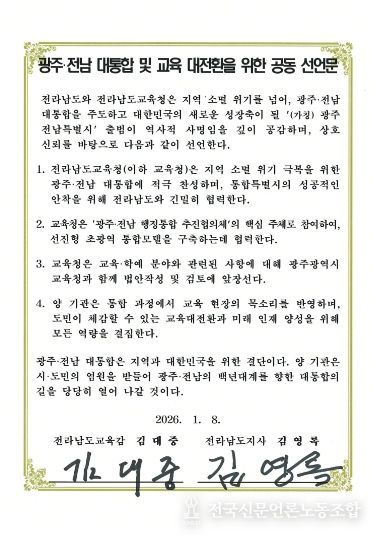 전국신문언론노동조합 김성길 기자 | 전라남도교육청과 전라남도가 광주·전남 대통합과 교육 대전환을 위한 공동선언문을 발표했다.