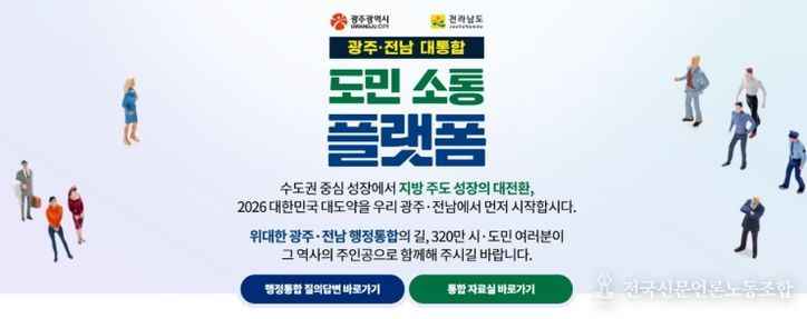 전국신문언론노동조합 김성길 기자 | 전라남도는 8일부터 광주·전남 행정통합에 대한 시·도민의 폭넓은 의견 수렴과 공감대를 높이기 위해 ‘광주·전남 대통합 도민 소통 플랫폼’을 운영한다고 밝혔다.