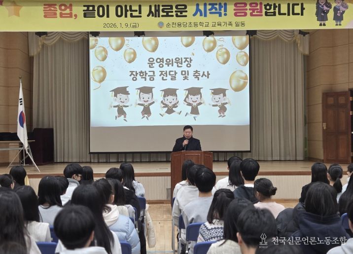 김 위원장은 이날 축사를 통해 “졸업생 여러분은 순천용당초등학교에서 배움의 기쁨과 친구의 소중함, 그리고 서로를 존중하고 배려하는 마음을 배웠다”라며 “이 경험은 앞으로 어떤 길을 가든 여러분을 바르게 이끌어 줄 평생의 자산이 될 것”이라고 말했다.