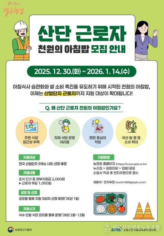 다만 천원의 아침밥 사업에 선정된 산단 입주기업 등은 직장인의 든든한 점심 사업에 중복으로 지원받을 수 없다.