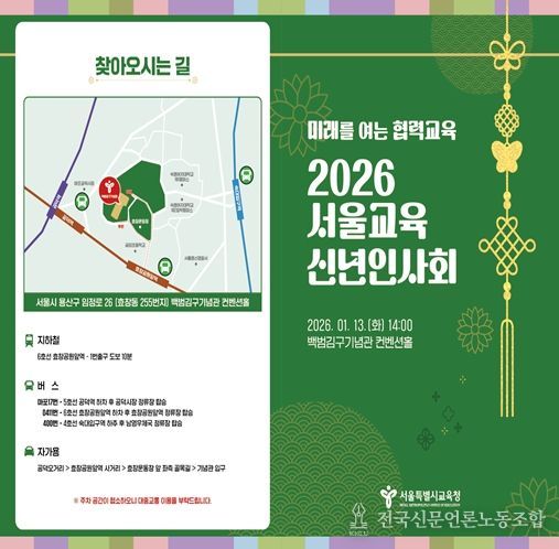 전국신문언론노동조합 강찬희 기자 | 서울특별시교육청은 오는 1월 13일에 용산구 백범김구기념관 컨벤션홀에서 ‘2026년 서울교육 신년인사회’를 개최한다.